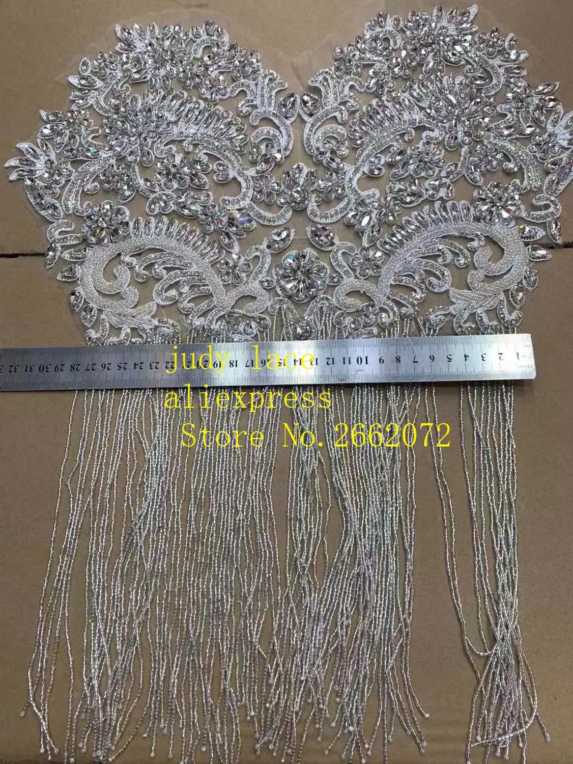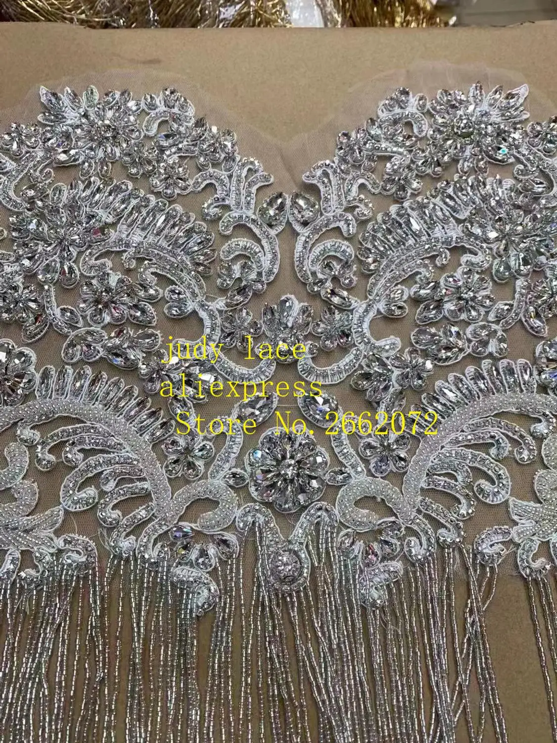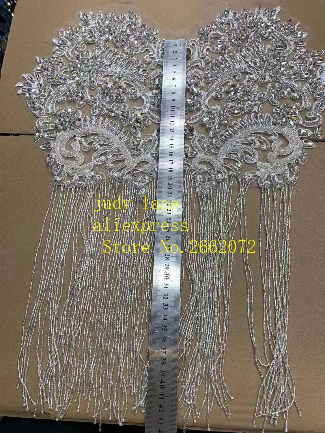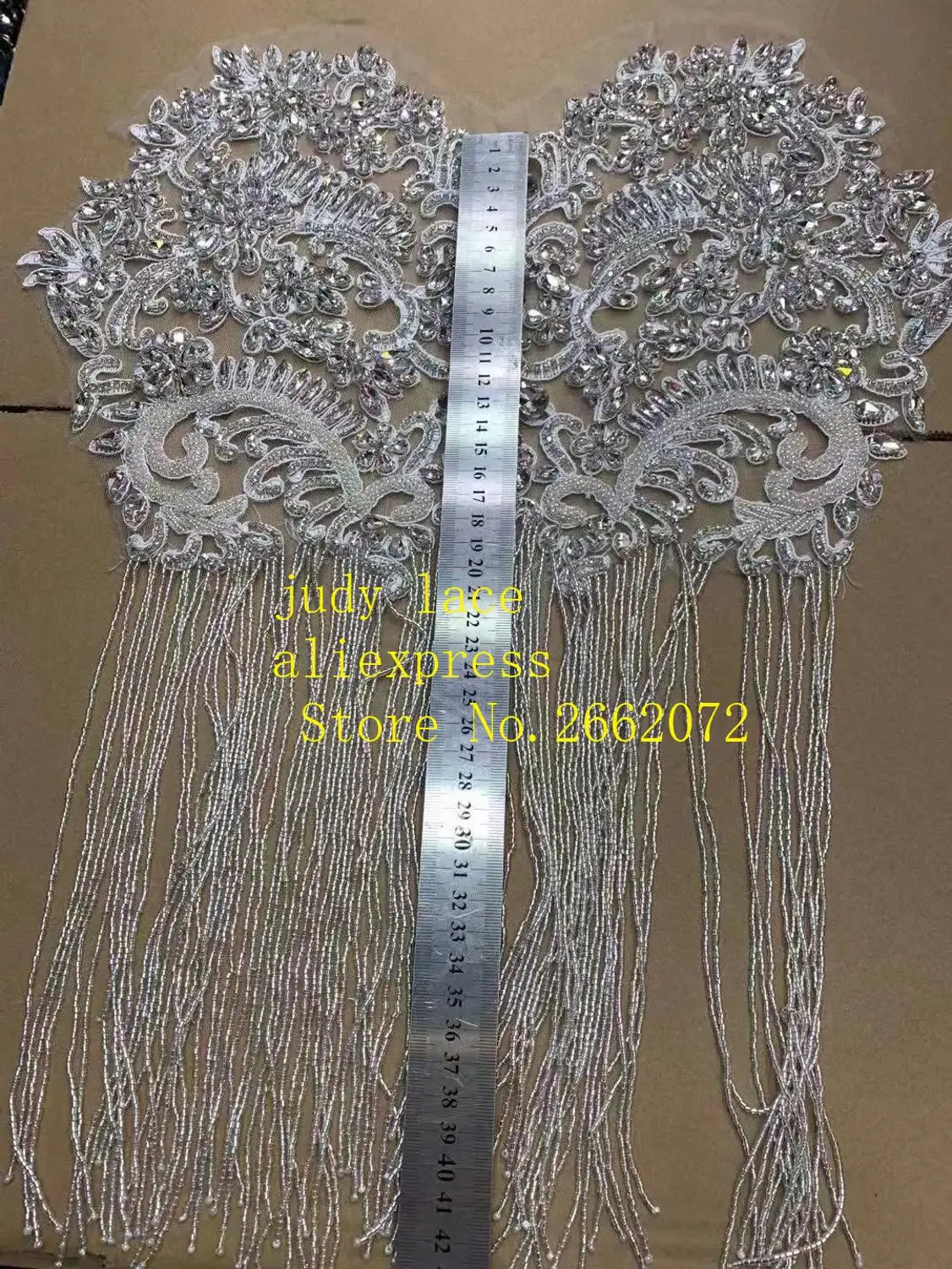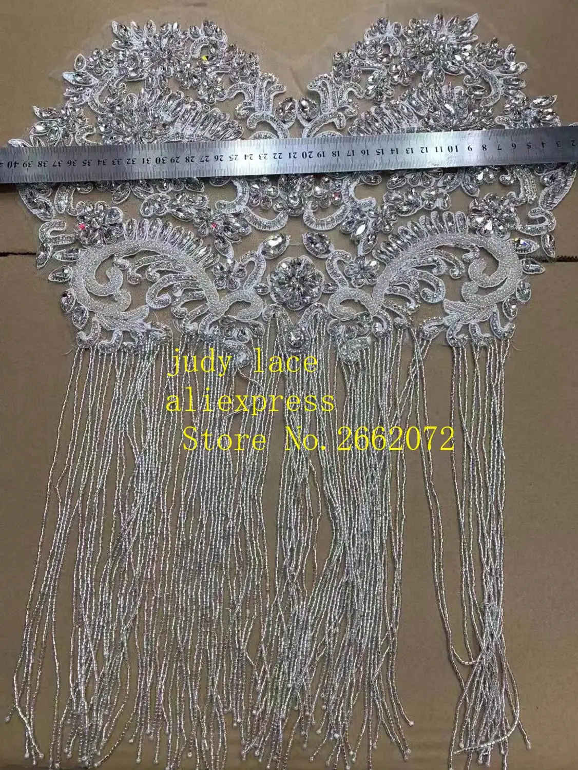 Very best stock 1piece/bag Silver luxury necktie tassel beads set with artificial diamonds for wedding dress